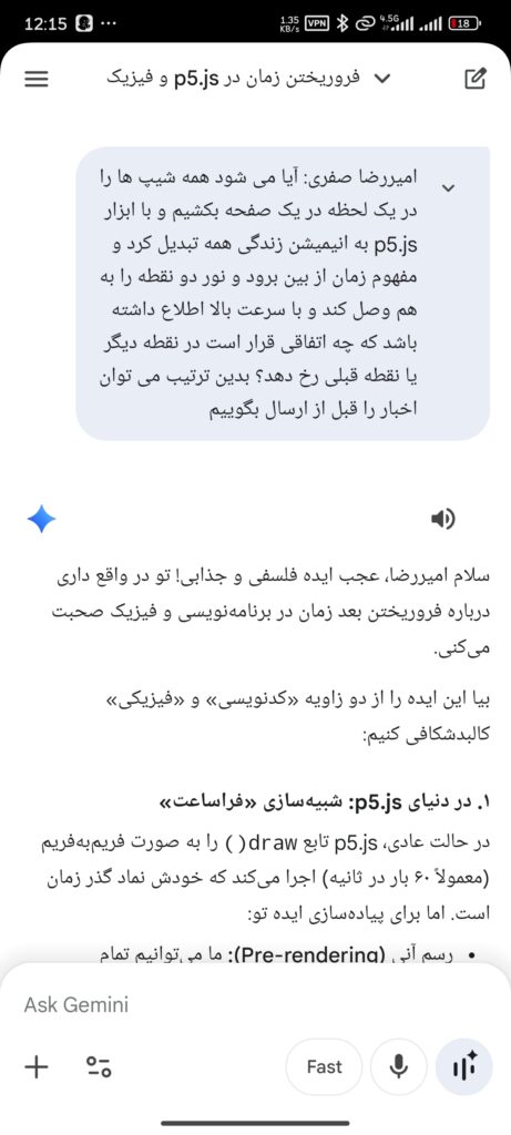 امیررضا صفری آیا می شود همه شیپ ها در یک لحظه در یک صفحه بکشیم و با ابزار P5.JS به انیمیشن زندگی تبدیل کرد و مفهوم زمان از بین برود و نور دو نقطه را به هم وصل کند و با سرعت بالا اطلاع داشته باشد که چه اتفاقی قرار است در نقطه دیگر یا نقطه قبلی رخ دهد ؟ بدین ترتیب می توان اخبار را قبل از ارسال بگوییم
